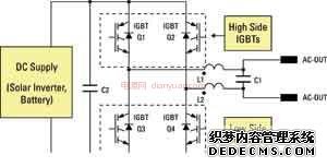 因为这个设计所实施的逆变器拓 扑属于全桥,所以有关的太阳能逆变器采用了4个高电压IGBT,如图1所示。在这个电路中,Q1和Q2晶体管被指定为高侧IGBT,而Q3和Q4则为低侧 功率器件。为了要保持总功率耗损处于低水平,但功率转换则拥有高效率,设计师要在这个DC/AC逆变器解决方案正确应用低侧和高侧IGBT组合。