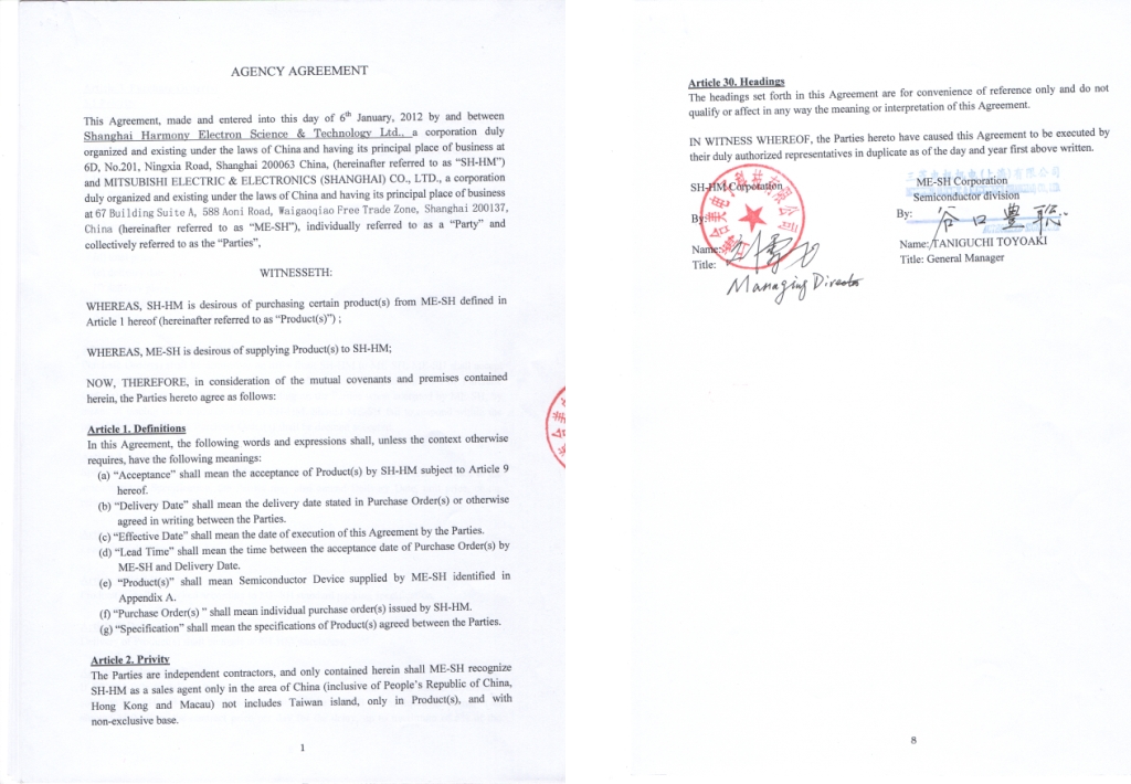 上海合美电子科技有限公司与上海三菱电机所签订的代理协议